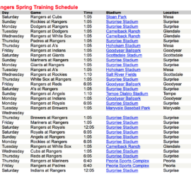 In six days, guys wearing Rangers uniforms will play guys wearing other teams’ uniforms. And the spring training exhibition season will be underway. Here is the schedule: