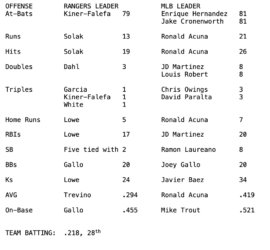 So, the season is two weeks old. The Rangers have played six series. They’ve won three, lost three. Overall, they’re 9-10, and in fourth place. Here are the team leaders compared to the major league leaders in the same categories. Two things emerge from this. One, Joey Gallo is having […]