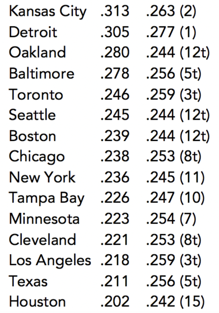 Here are the team batting average after two weeks of play in 2015 in the AL, compared to what those teams hit in 2014, with their final position in parenthesis.