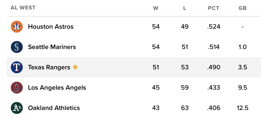 Both Houston and Seattle won (the Mariners have been gifted a series with the White Sox), meaning the Rangers dropped a game behind.