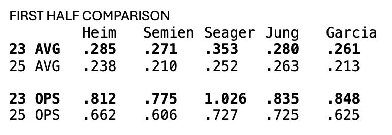 So far in 2025, here are their numbers. Heim: .238/.662. Semien: .210/.606. Seager: .252/.727. Jung: .263/.725. Garcia: .213/.625.