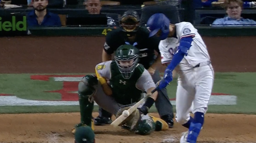 In Josh Jung’s first at-bat back in the big leagues, he hit a home run to put the Rangers up 1-0. It was their only hit through the first four innings.