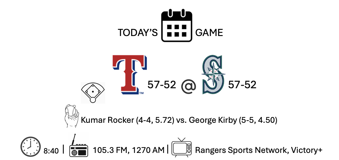 So, from here on out it’s going to be a sprint to the finish, the final fifty-one games. The Rangers are going into this mad dash unable to beat left-handed pitching. They have until 5:00 tonight to remedy that. Seattle has already addressed its offense by re-acquiring third-baseman Eugenio Suarez, who had thirty-six home runs for the Diamondbacks.