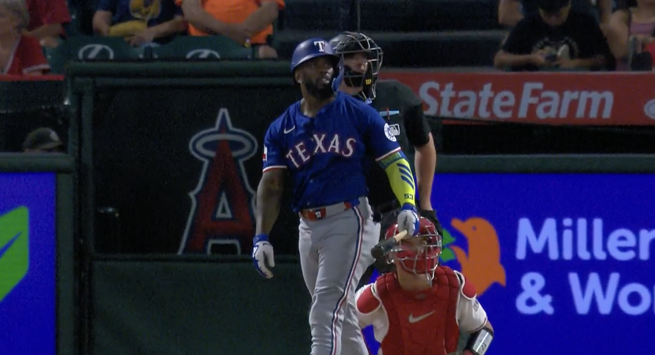 Adolis Garcia watches his 2-run HR land over the left field wall in Anaheim, giving the Rangers a 4-1 lead.
