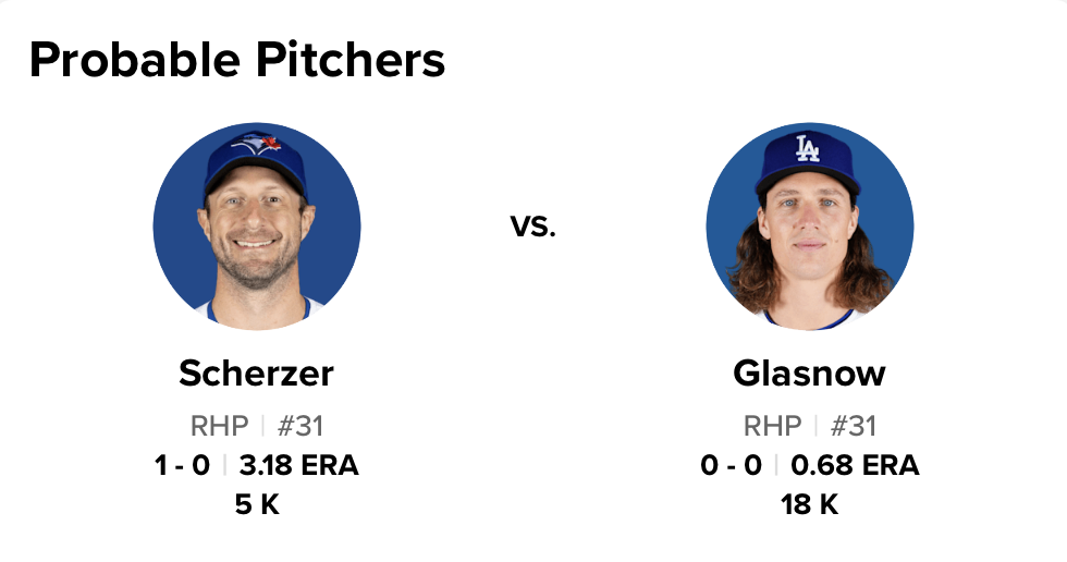 Forty-year-old Max Scherzer will get the start for Toronto against Los Angeles’s Tyler Glasnow. On paper, this one favors the Dodgers.