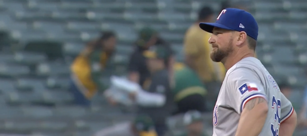 The Rangers bullpen has three reliable arms. Okay, now two. Josh Sborz came off the I.L. just a few days ago and might be headed back after walking off the field in the fifth inning, having given up a walk, and a 3-1 count to a second Athletics hitter.