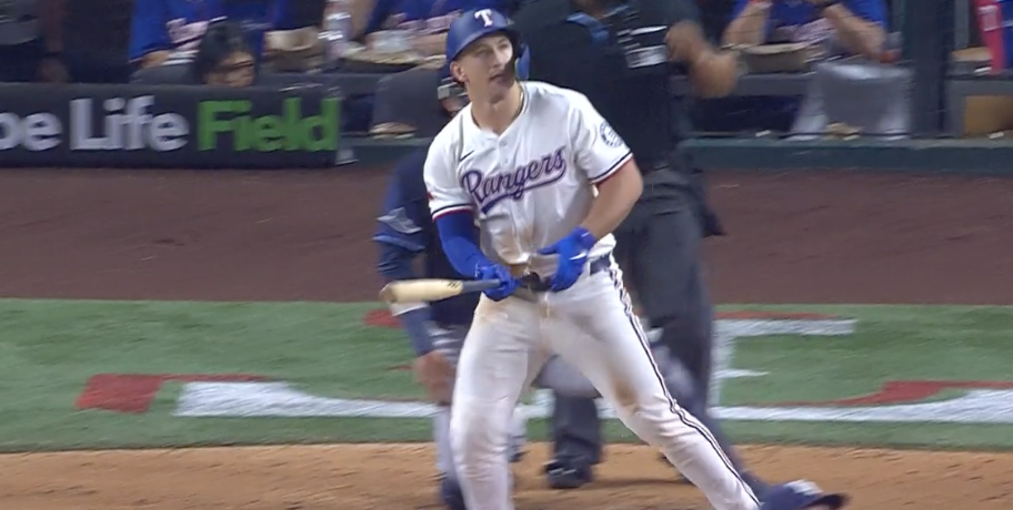 Wyatt Langford watching his hit sail over the left-field wall for a game-winning two-run homer.