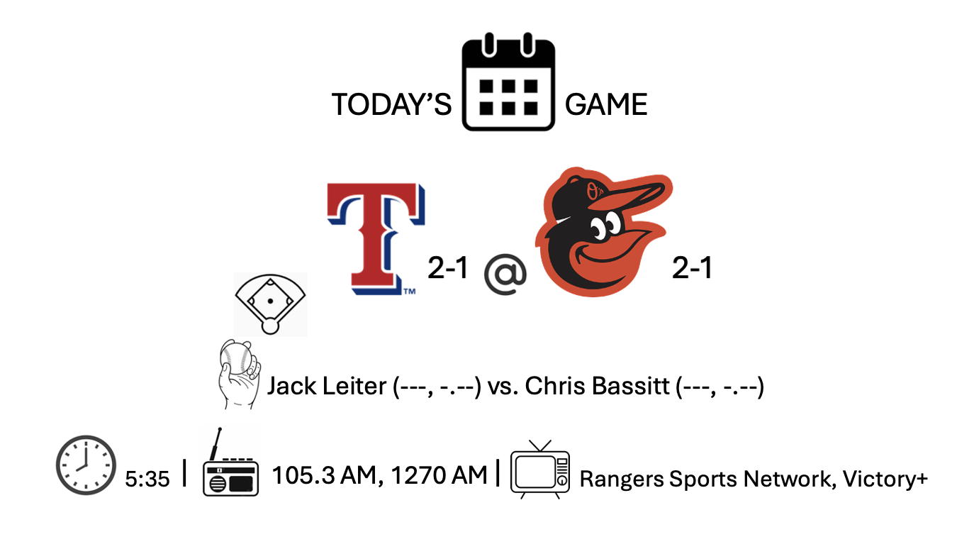 The Rangers head to Baltimore for three games starting today, are 2-1, after winning their first series of the year.