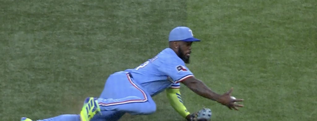 Rangers outfielders made two spectacular plays yesterday, beating the Phillies outfield fielders in spectacular plays. If the score of games was determined by spectacular plays, the Rangers would have won 2-0.