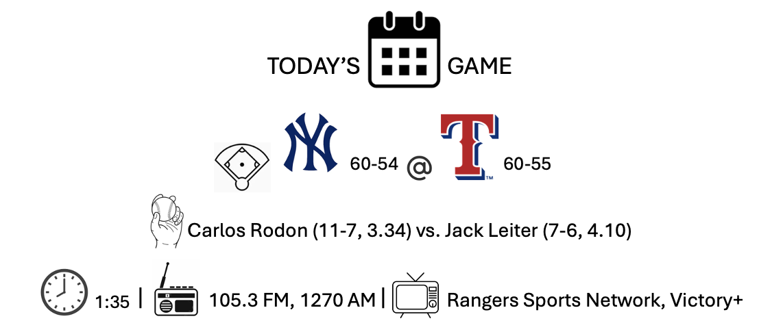 The Rangers go into today’s game without Luke Jackson, with a possible closer after nearly 120 games, and with the potential to sweep the Yankees, who are coming off getting swept by the Marlins for the first time in their history. A win by the Rangers would leapfrog them over the Yankees and into the third wildcard spot.