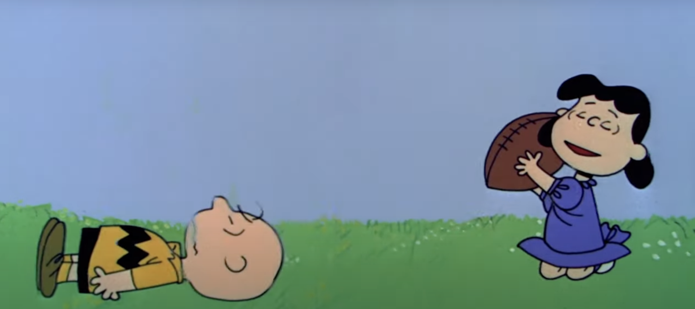 Believing her, he runs full speed at the football she is holding for him to kick, with a look of dogged determination on his face. He nears the football. He rears his foot back for the strike. He kicks at the ball. Then, whoosh, the ball is snagged away. Like a fool, he fell for it again. Literally. He is lying on his back, wondering why he was duped again.