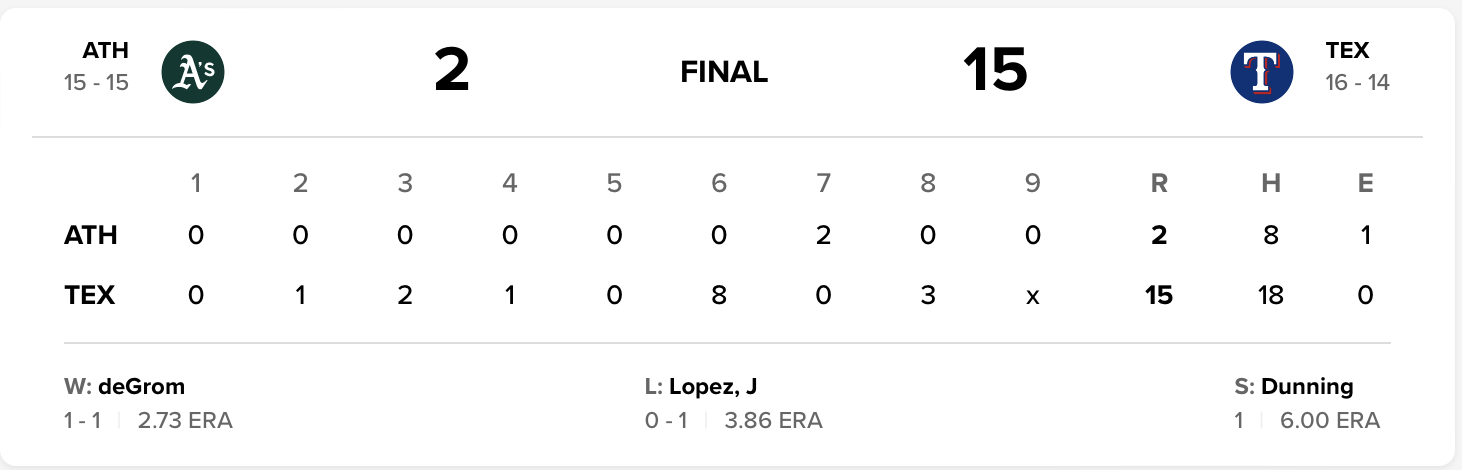 Dane Dunning earned his first major league save, a masterful three-inning performance in which allowed only two earned runs on four hits, only one of which was a home run, while walking just two Athletics hitters in his three innings of work.
