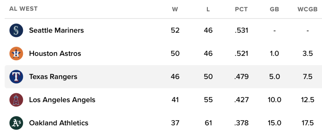 So, it means the only way the Rangers have a legitimate shot at making the playoffs is winning the A.L. West. It’s the weakest of the six divisions. Seattle is leading but Seattle is Seattle and Seattle will always be Seattle and that means Seattle will cough up the lead very soon. Currently they lead Houston by one game and play Houston three games right after the All-Star break.