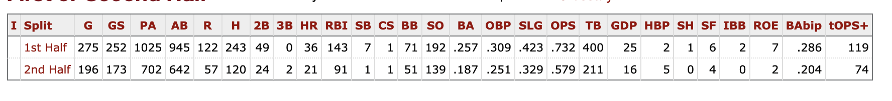 Just looking at batting average alone, he falls off 70 points. Everything else offensively is a steep drop as well. Last season he went from .242 in the first half to .182 in the second. In his All-Star, breakout year, he was even worse, plummeting from .282 to .217. His 2022 splits: .262/.181.