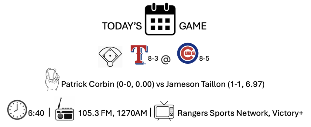 Josh Jung returns to the lineup tonight. But he’s more like a guest host. He’s here only temporarily until his next injury. The hope is he kickstarts this offense. and maybe he will. Jung was 3-for-7 before his latest injury. Texas is going to have to find some offense in a hurry. After all, Patrick Corbin makes his Rangers debut tonight. He passes out offense like the most popular house at Halloween passed out candy.