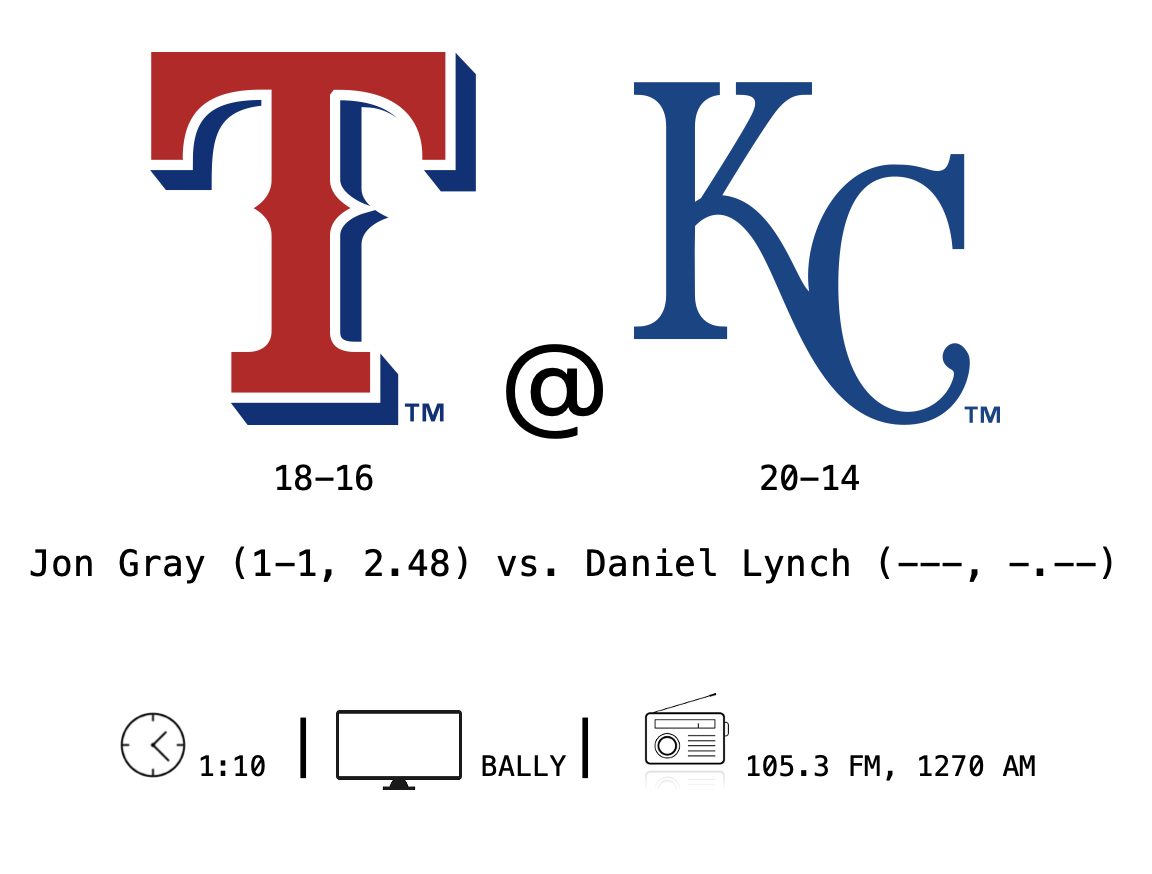 So, now the Rangers go for the series win, which would be a good early season accomplishment against this really strong Royals team, down two of their starters in Langford and Jung. Down four starters.