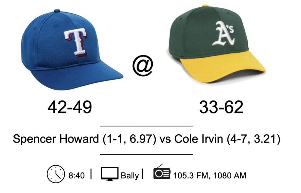 The Rangers now move 3,000 miles west to face the worst team in baseball, the Oakland Athletics, who sold off most vestiges of major league talent in the off-season. They have an official major league charter without the major league talent. Genius. The Rangers tried that for the last five years. Profitable if you can pull it off.