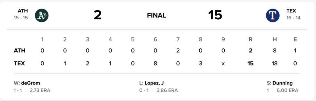 Dane Dunning had done it. He earned the save. He had nailed down the 13-run victory. He helped secure Jacob deGrom’s first win since 2023. He ensured that the Rangers best offensive outpouring of the year—their first double-digit game, their highest hit total at eighteen—was not for naught.